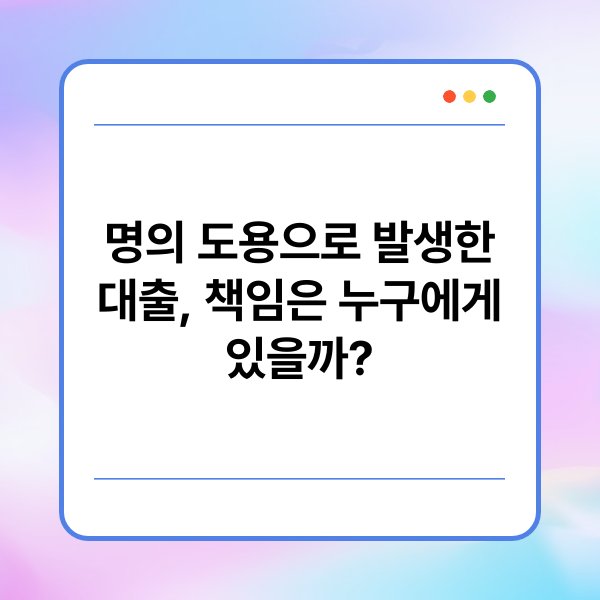 명의 도용으로 발생한 대출의 법적 책임은 여러 주체에게 분산될 수 있습니다. 주로 대출을 받은 자와 금융기관이 주요 책임 주체로 지목됩니다. 그러나 실제로는 피해자의 동의 없이 이루어진 대출이기 때문에 피해자도 일정 부분의 책임을 질 수 있습니다. 각 주체의 책임은 사건의 경과와 관련 법령에 따라 달라질 수 있습니다.