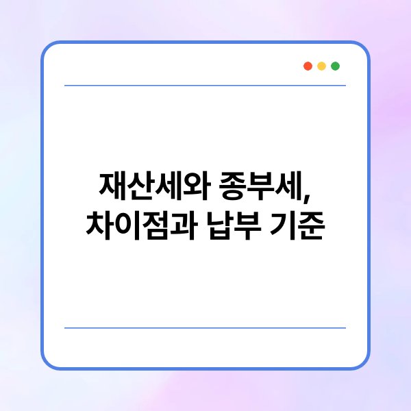 재산세와 종합부동산세는 세금 종류와 부과 목적에서 차이가 있습니다. 재산세는 지방세로, 지방 정부의 재정 수입을 위한 목적으로 부과됩니다. 반면, 종부세는 고가 자산에 대한 세금 부담을 강화하기 위해 국세로 부과됩니다. 이로 인해 두 세금의 부과 방식과 세액 산정 기준이 상이합니다. 이러한 차이는 세금 납부자가 알아야 할 중요한 요소입니다. 특히, 고가 부동산을 소유한 경우 두 세금 모두를 고려해야 합니다.